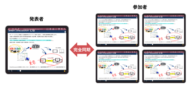 SmartDiscussionの画面同期機能では、発表者の画面操作が各議員の端末へリアルタイムに同期されるため、
